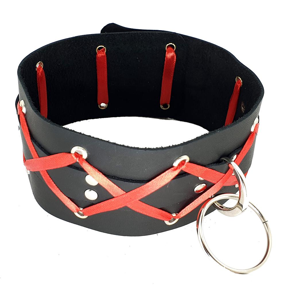 Нет в наличииОшейник из натуральной мягкой кожи чёрного цвета шириной 6 сантиметров с декоративной шнуровкой лентой красного цвета. Кольцо для крепления поводка.