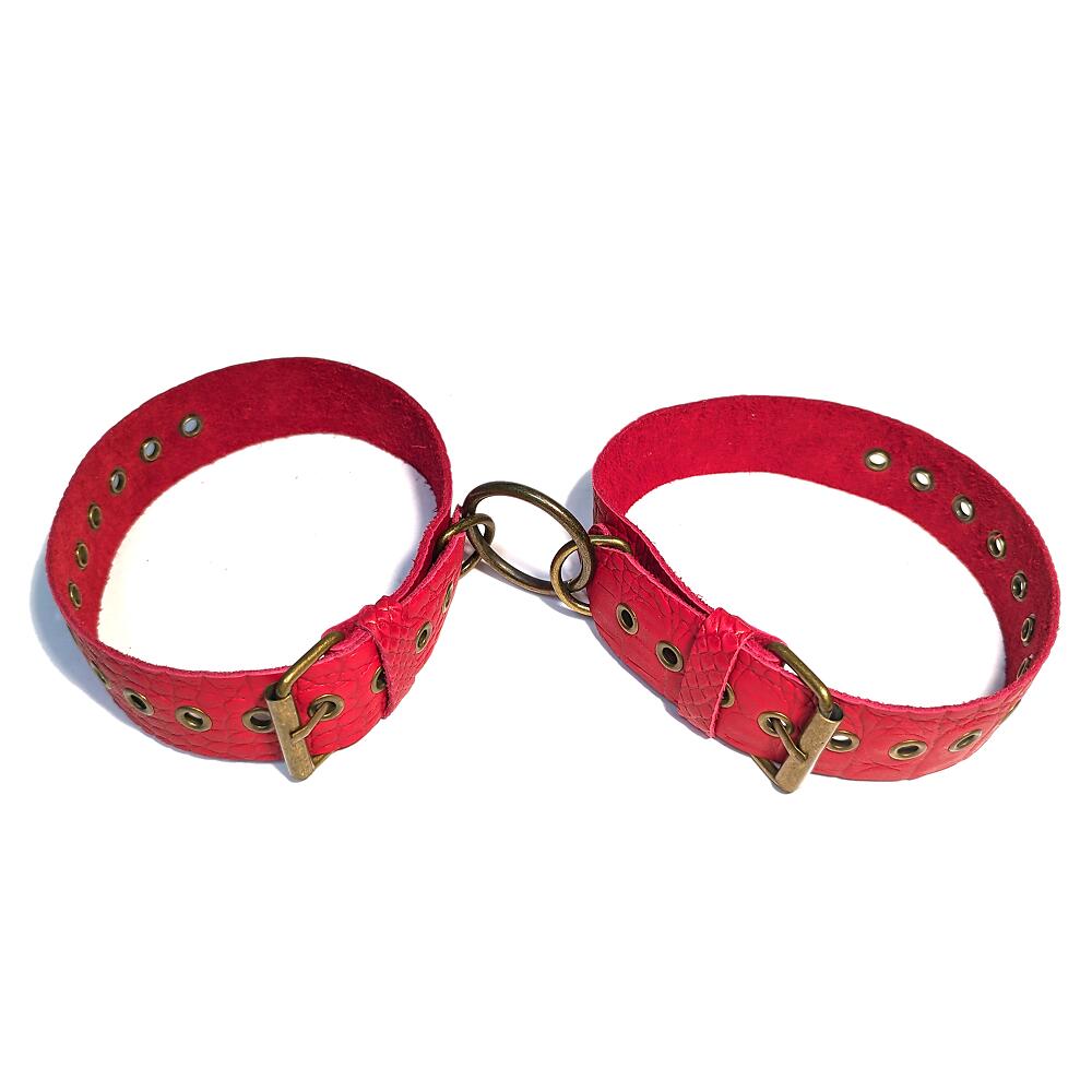 Наручники изготовлены из натуральной кожи красного цвета с текстурой "змея" Снабжены полукольцами и соединены кольцом