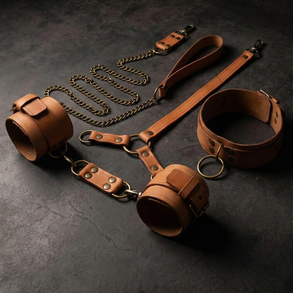 Набор БДСМ из натуральной кожи. Ошейник, наручники, поводок, фиксатор ошейник-наручники, соединитель